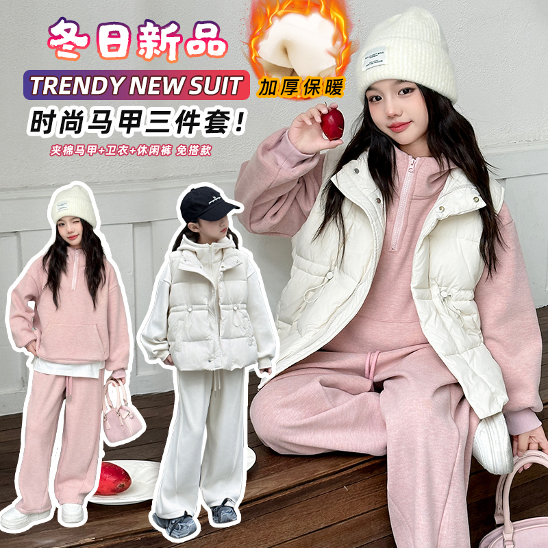 女童套装2025新款宝宝冬装衣服小女孩加厚卫衣儿童夹棉马甲三件套
