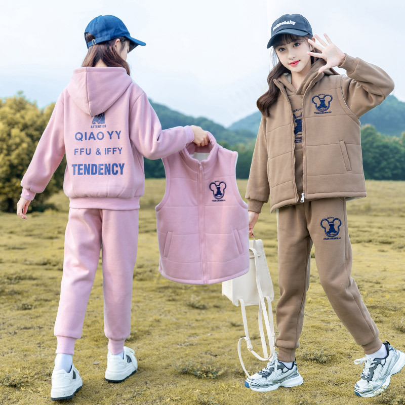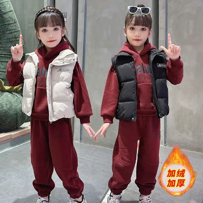 女童秋冬加绒套装洋气新款中大童冬装穿搭女孩卫衣马甲三件套加厚