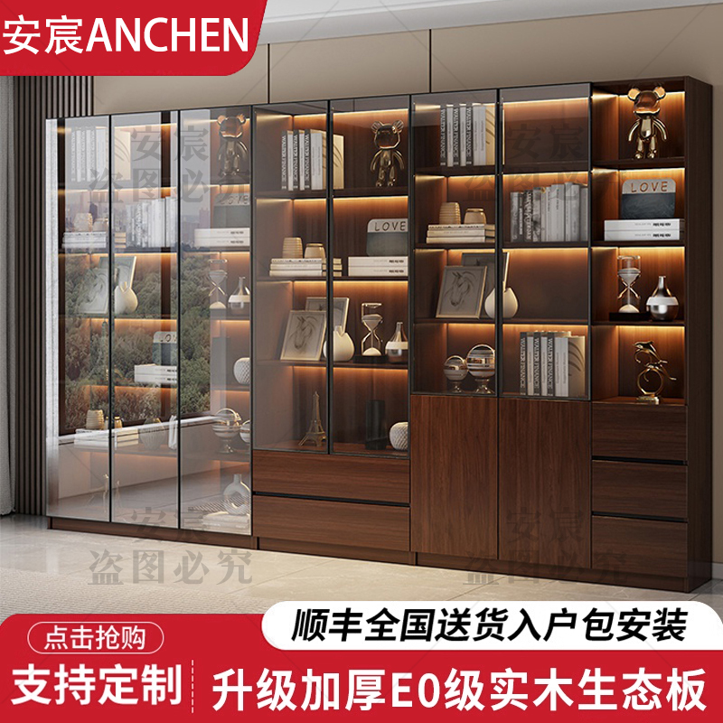 实木书柜书架组合客厅带玻璃门落地储物柜简约展示柜大容量的书柜