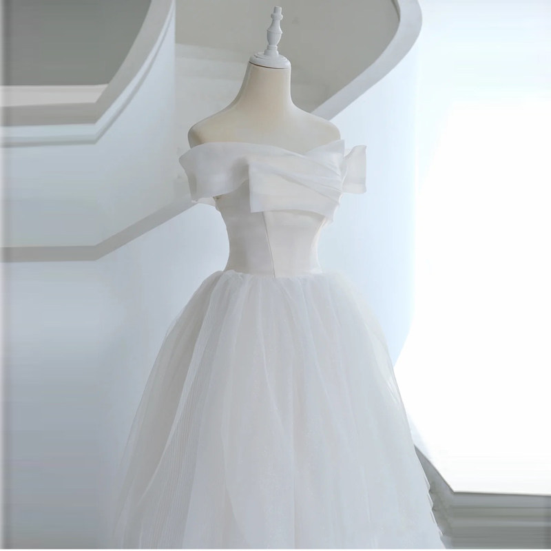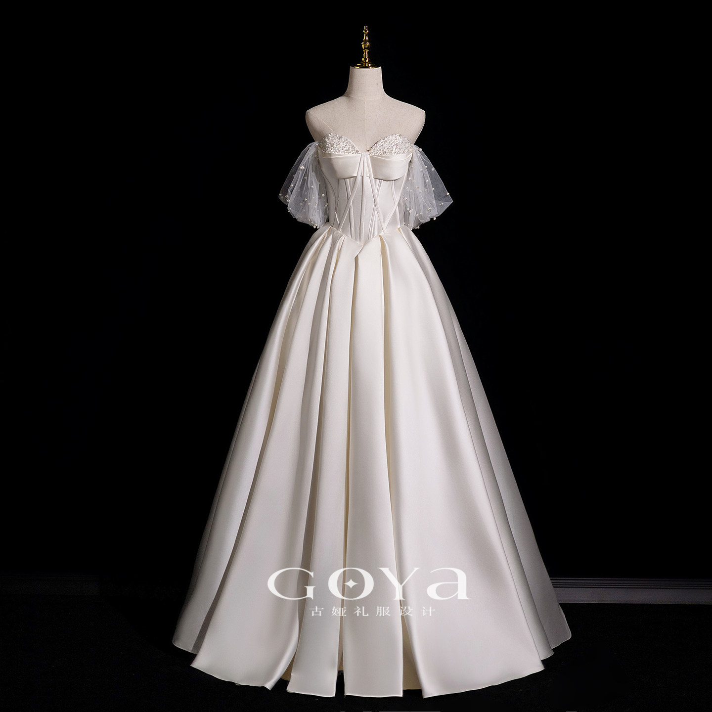 法式简约轻婚纱缎面高级感白色一字肩新娘结婚出门纱齐地迎宾礼服