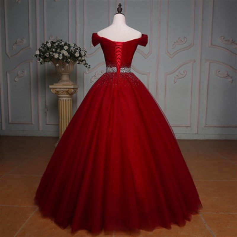 2025新款性感一字肩韩版v新娘红色婚纱礼服修身齐地主持人蓬蓬裙