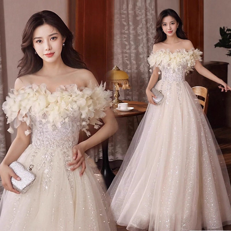 2025新款婚纱一字肩显瘦森系梦幻法式公主蓬蓬裙齐地出门纱网红款