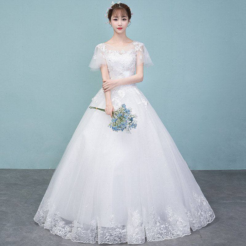 二手齐地婚纱一字肩中袖遮手臂蓬蓬细纱超仙显瘦八成新干净成人礼