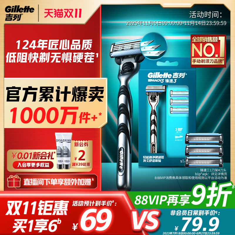 【双11立抢】吉列锋速3老式手动剃须刀男士刮胡刀胡须刀头刀片