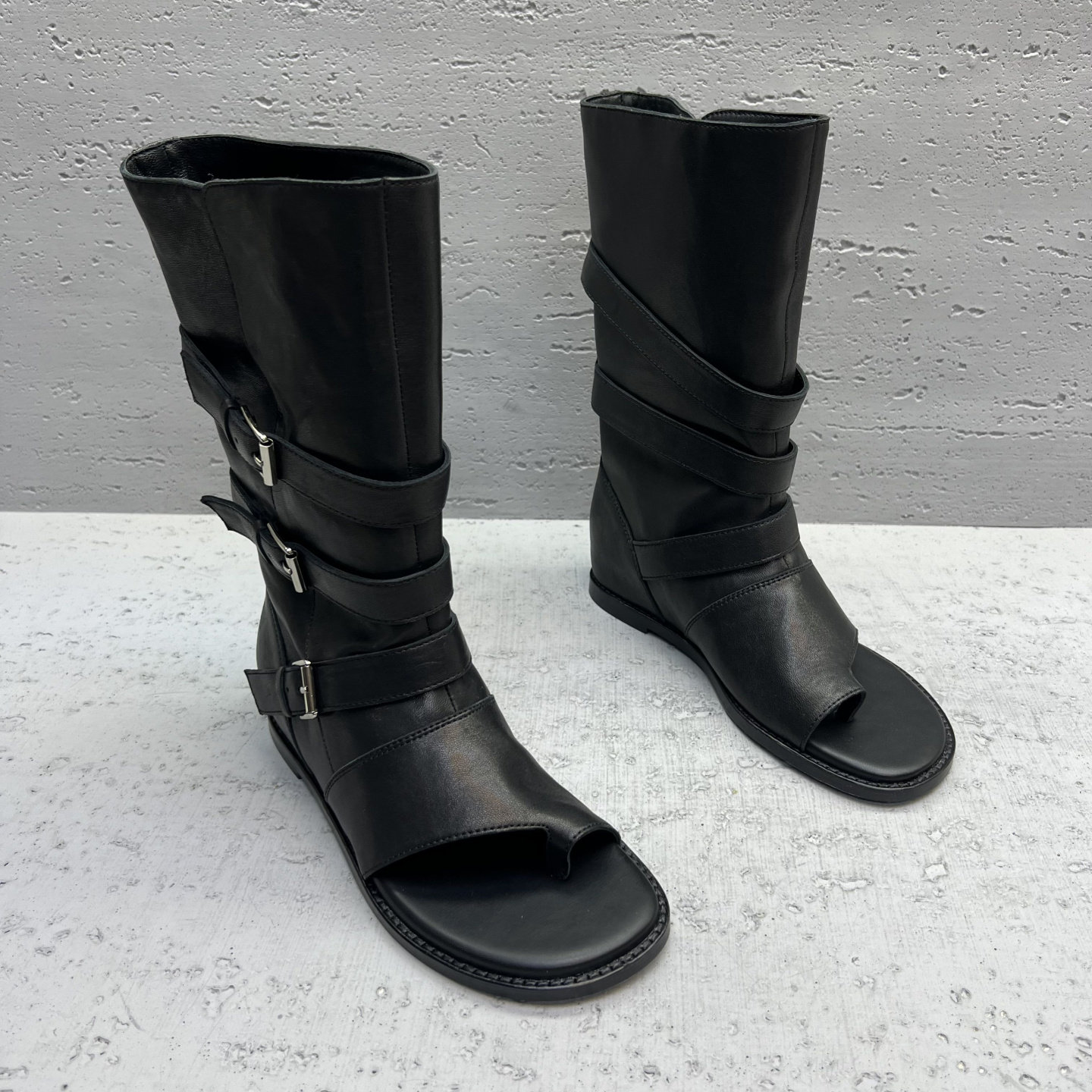 欧洲站真皮女靴2026春新款欧货低跟平底套趾露趾皮带扣中筒靴凉靴
