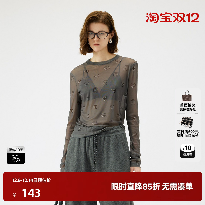 U/TI灰色满版印花薄款皮肤衣女 简约显瘦叠搭T恤尤缇2025秋季新款