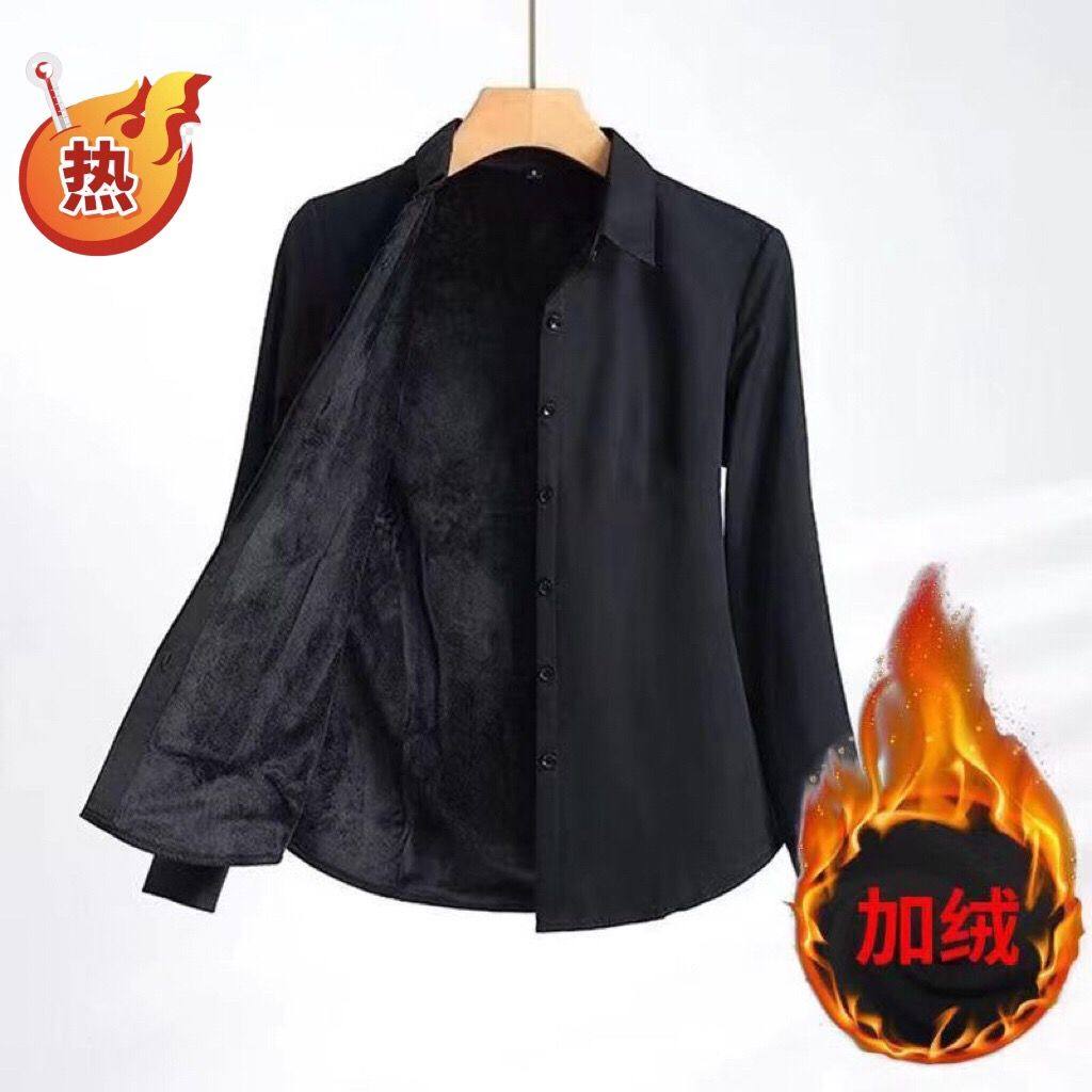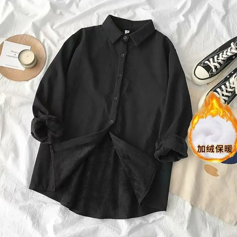 加绒保暖黑色衬衫女长袖2024秋冬职业装宽松大码加厚一体绒白衬衣