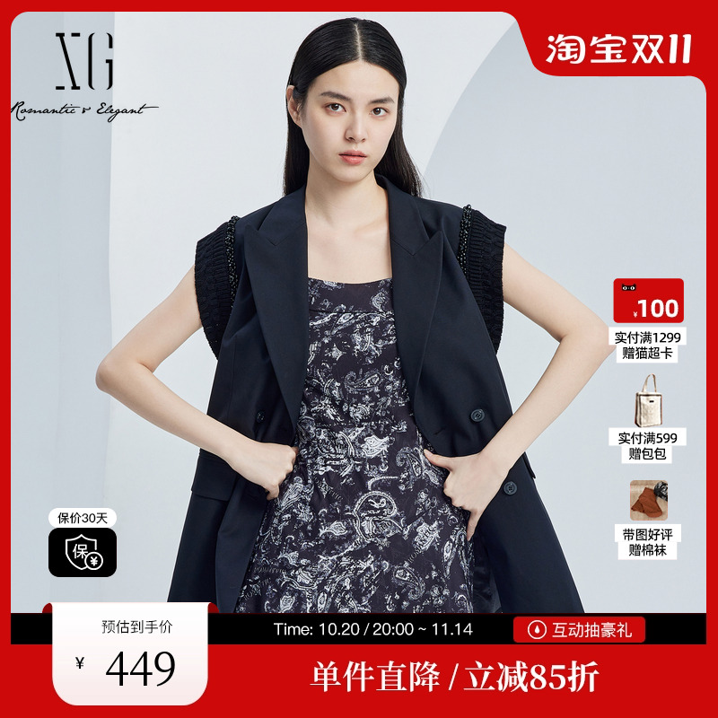 XG雪歌XJ324003A290黑色通勤马夹2025秋季新款长款西装马甲外套女