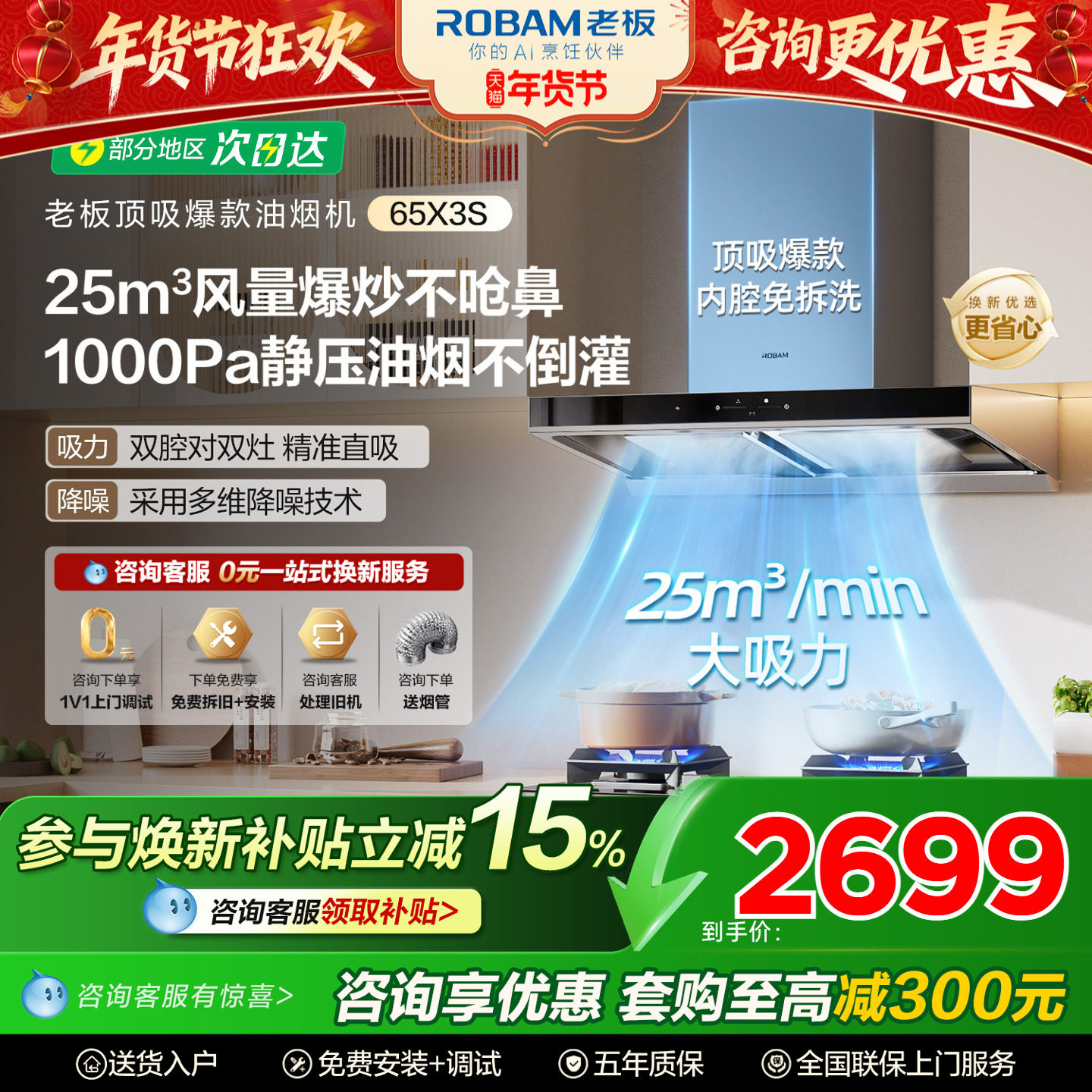 【顶吸爆款】老板双子星65X3S家用抽油烟机燃气灶套装官方正品