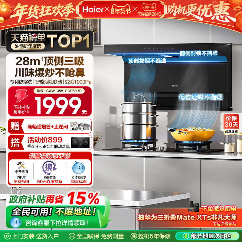 海尔大嘴C61Pro抽油烟机燃气灶一套大吸力顶侧双吸家用烟灶套装