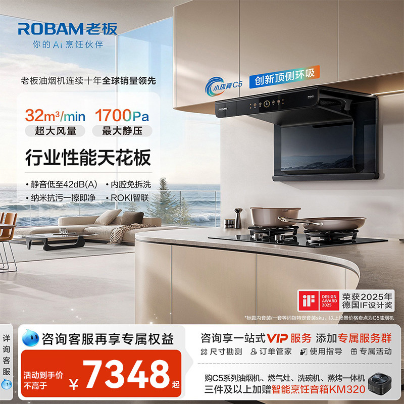 旗舰新品C5老板抽油烟机燃气灶套装顶侧环吸小环翼32m³超大吸力