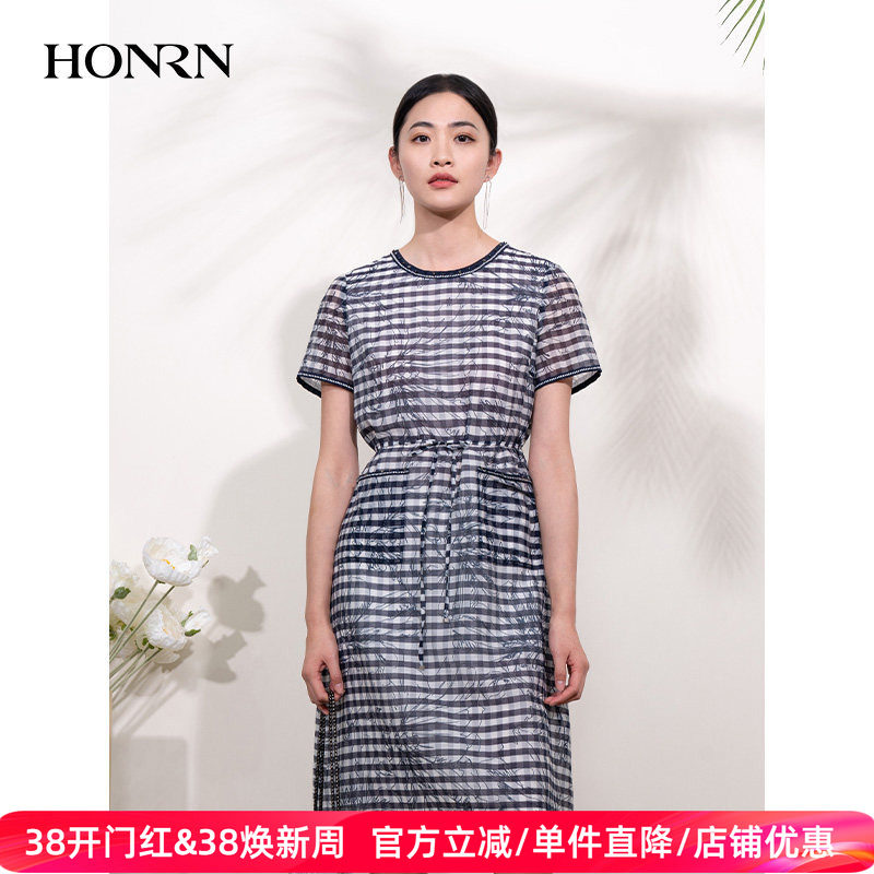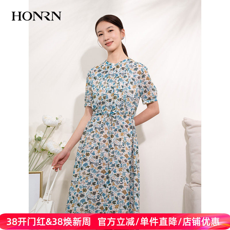 HONRN/红人薄款系带收腰印花短袖桑蚕丝真丝连衣裙女夏HI22OL498