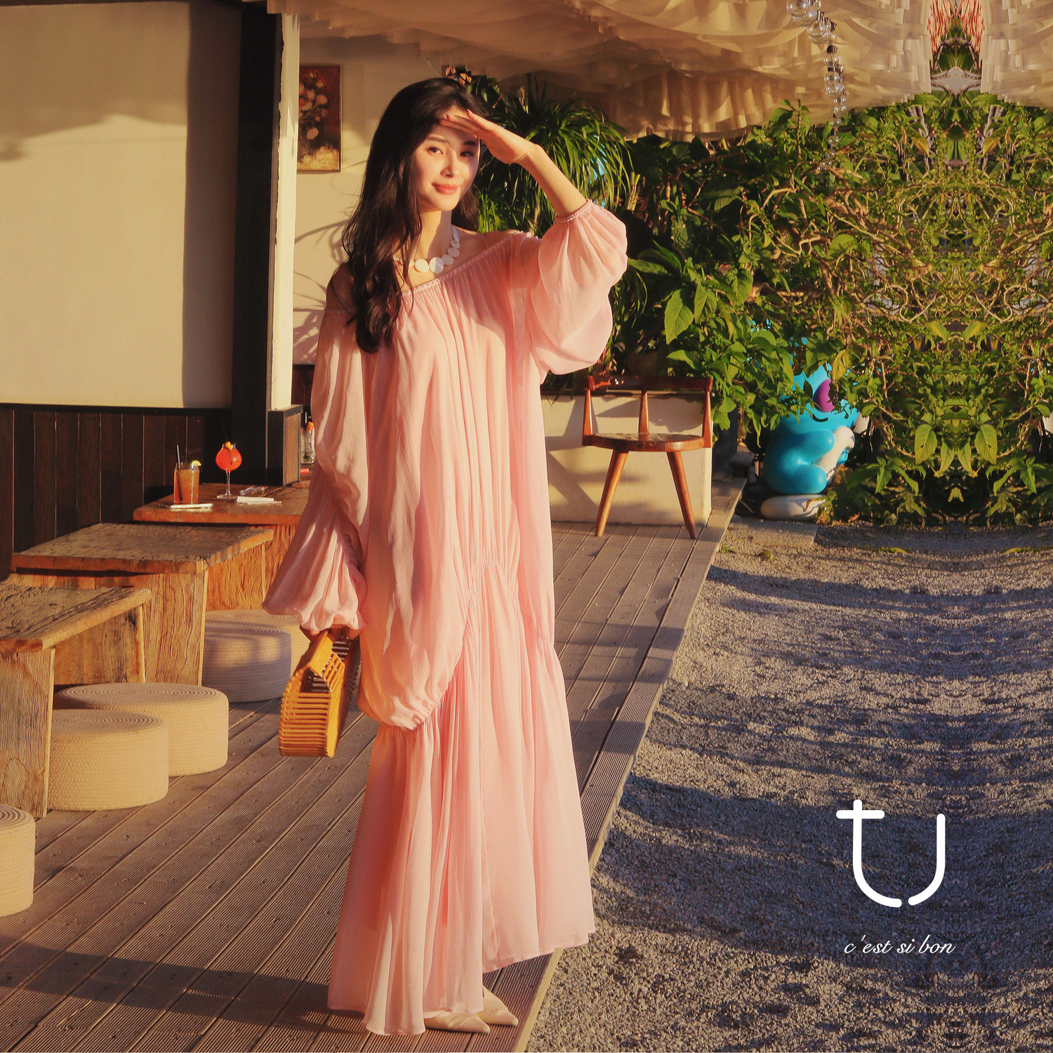 超仙时尚沙滩沙漠旅游度假拍照真丝桑蚕丝连衣裙三亚超长大摆长裙