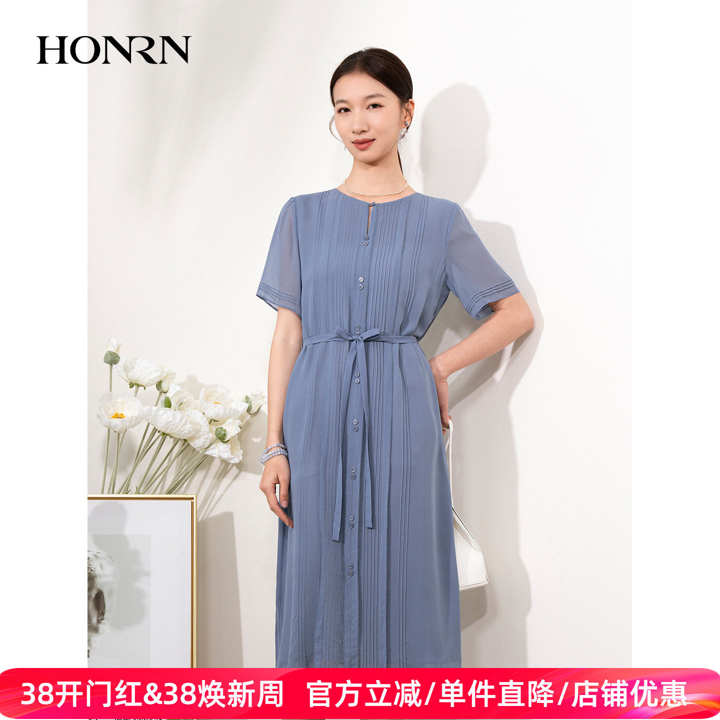 HONRN/红人气质桑蚕丝真丝系带收腰显瘦圆领连衣裙女夏HI22OL485