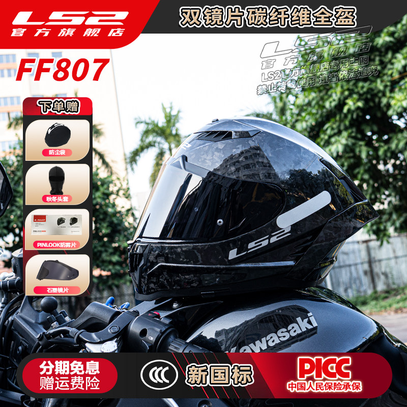 LS2摩托车碳纤维双镜片头盔男女机车赛车全盔四季防雾大尾翼FF807