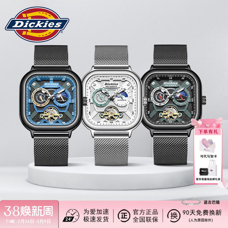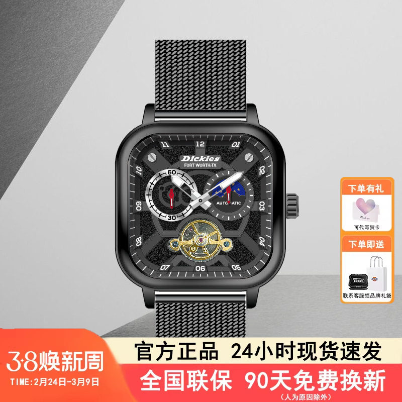 Dickies官方正品手表男方形全自动机械陀飞轮镂空学生防水腕表