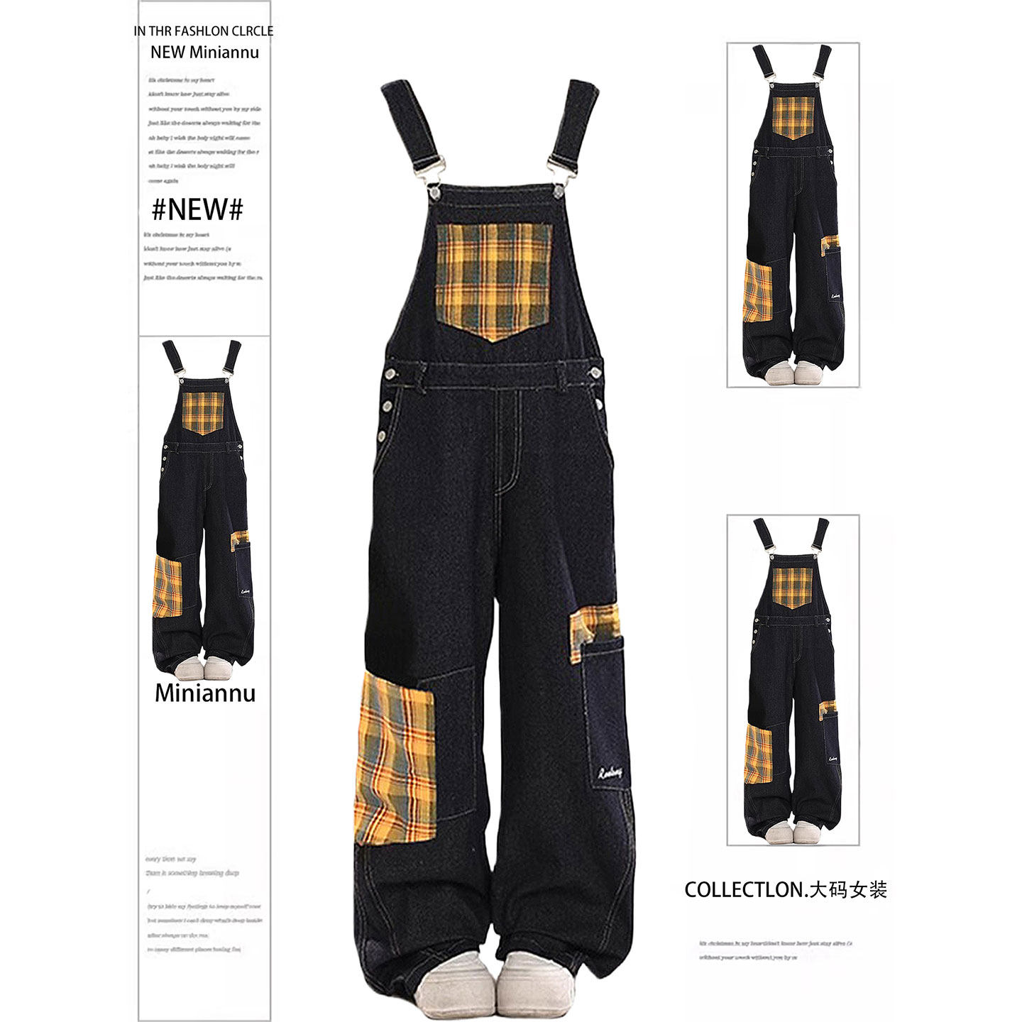大码胖mm复古格纹拼接牛仔背带裤女春季新款宽松直筒阔腿连体裤子