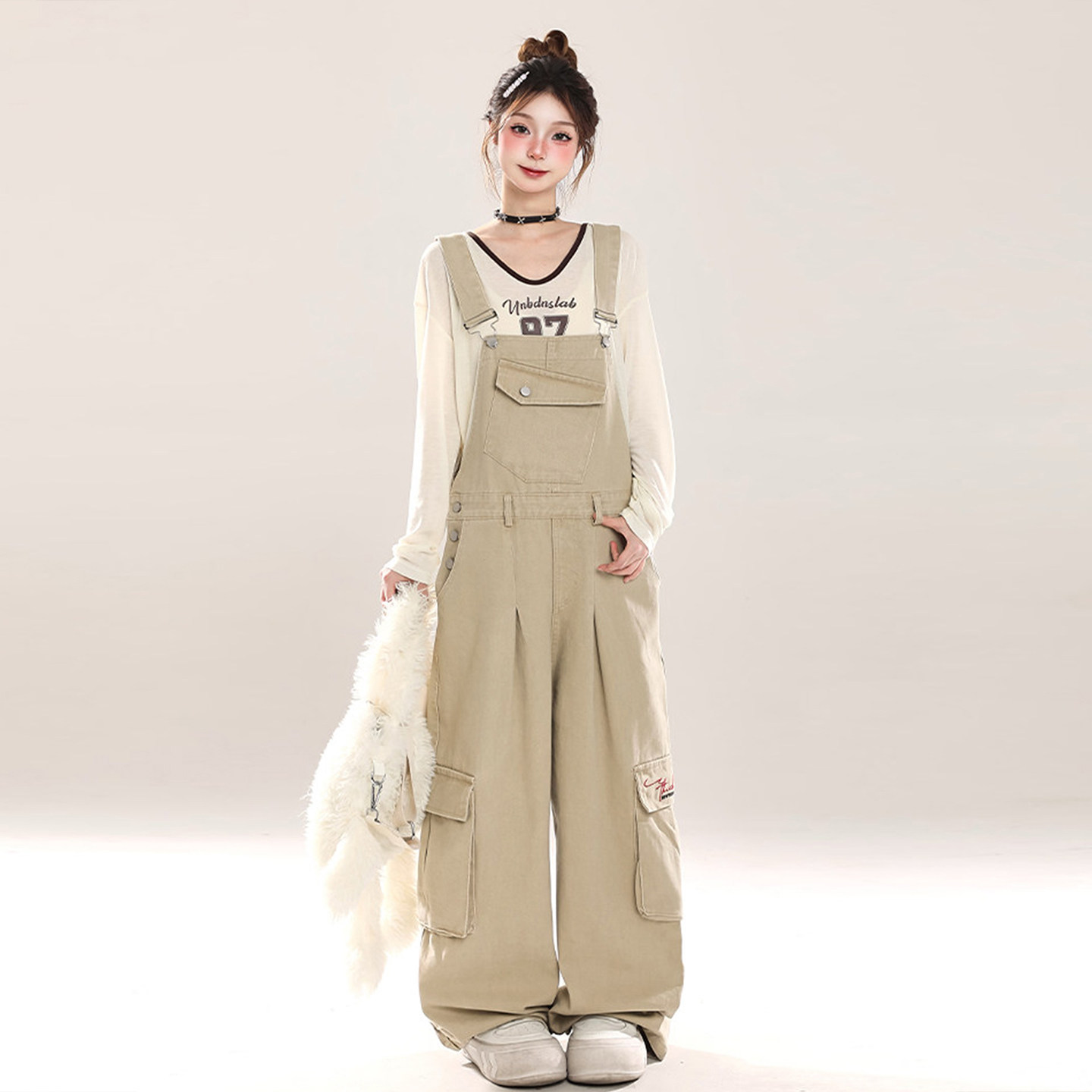 大码美式复古多口袋工装背带裤女潮牌宽松显瘦阔腿拖地连体长裤潮