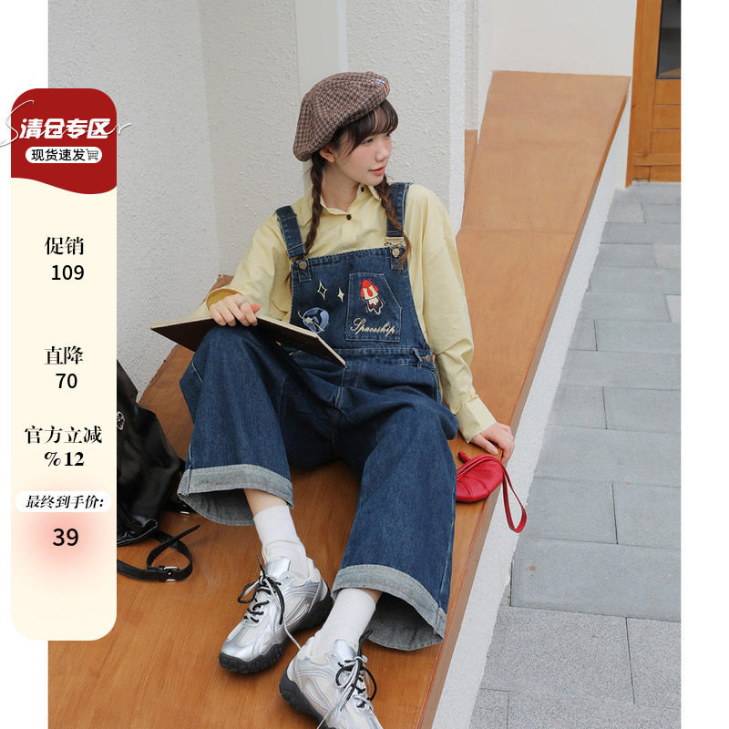 大码女装胖mm学生设计感阔腿牛仔背带裤女卡通刺绣松弛感连体裤子