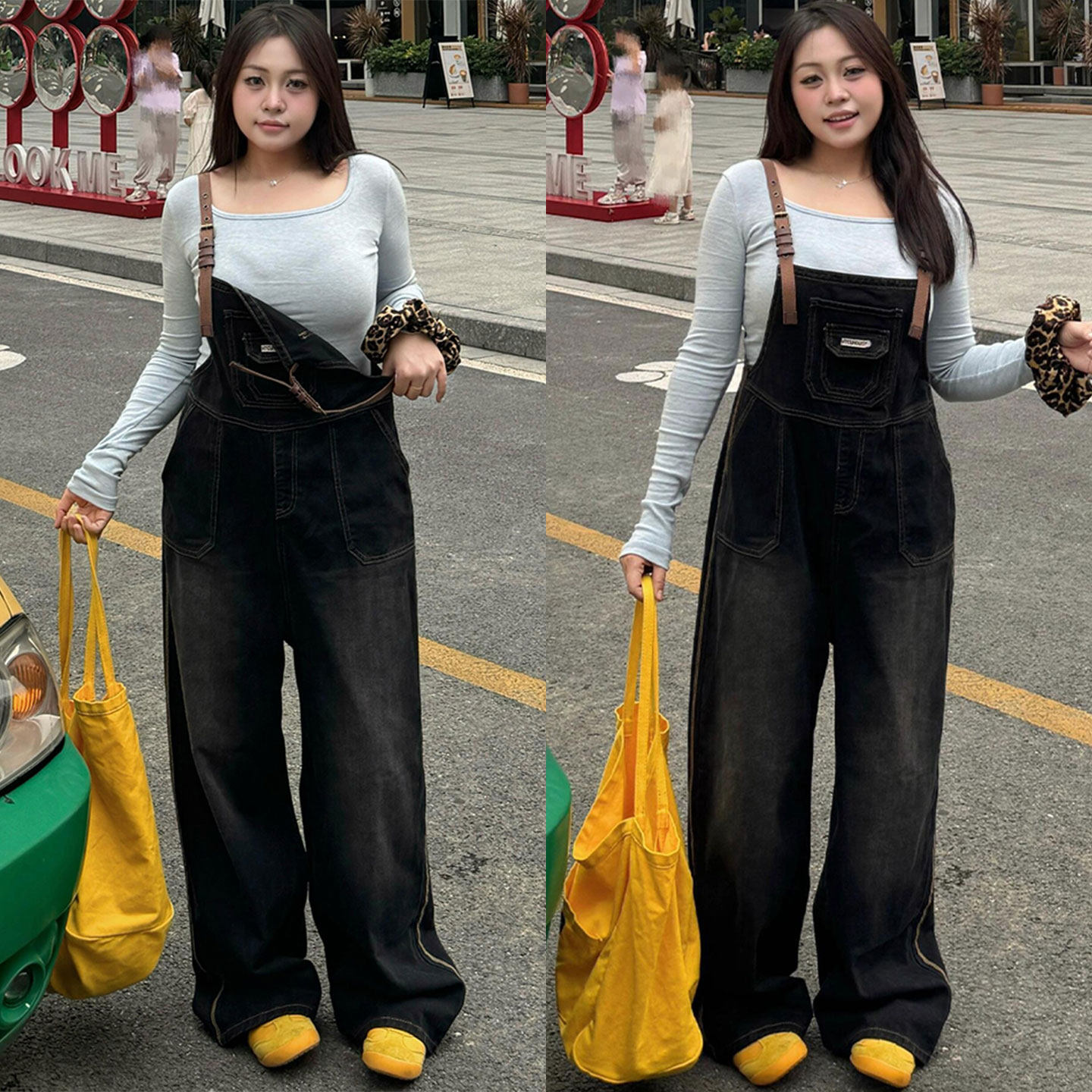 300斤大码女装胖mm黑色牛仔背带裤女美式高街复古宽松显瘦连体裤