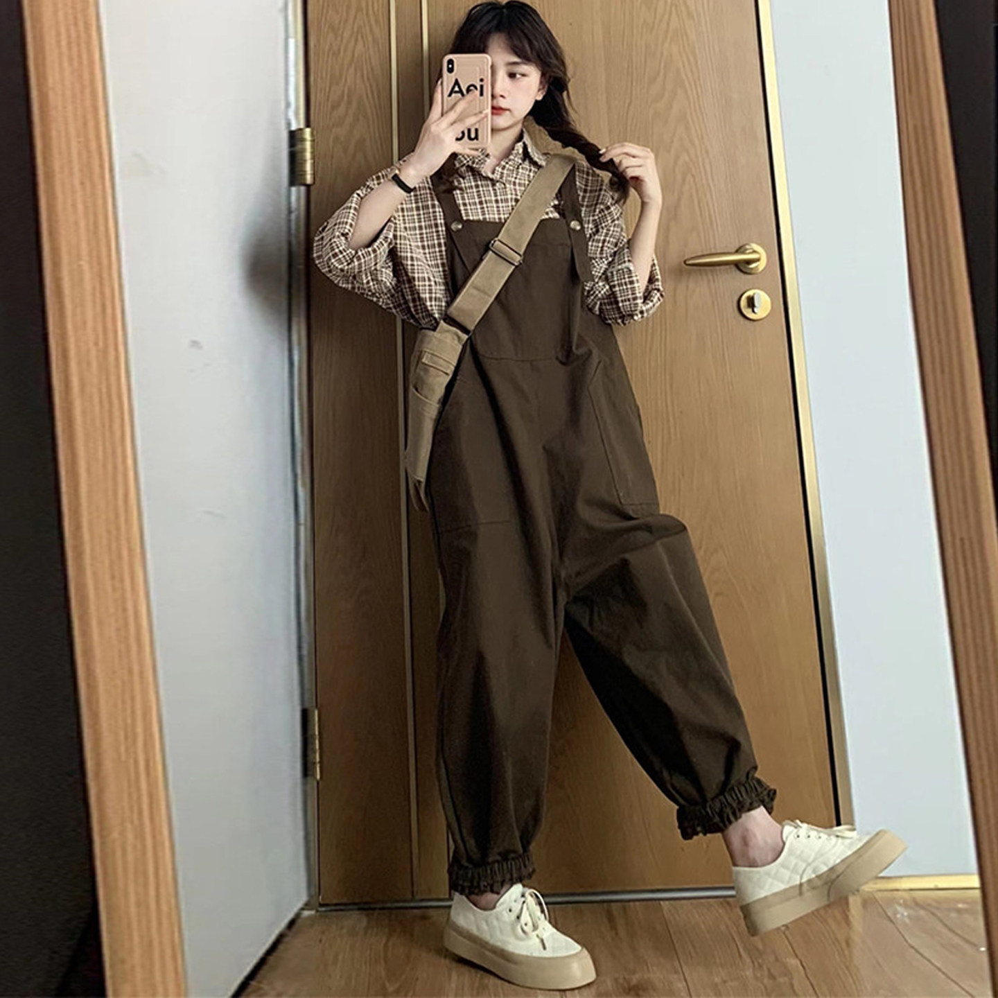 秋冬季新款大码女装胖mm工装背带裤休闲复古宽松显瘦吊带裤子女
