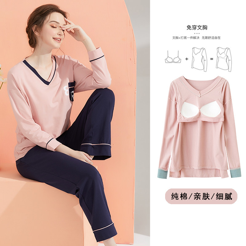 带胸垫长袖居家服女秋冬款纯棉宽松带杯睡衣两件式套装免文胸起居