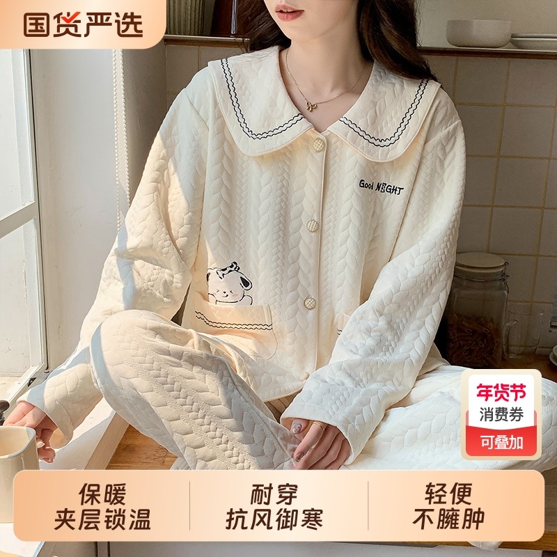 睡衣女秋冬季款珊瑚绒加厚加绒三层夹棉保暖家居服套装可外穿新款