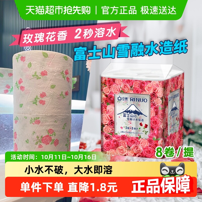 日诺日本进口有芯卷纸卷筒纸87.75g*8卷玫瑰花溶水卫生纸厕纸1提