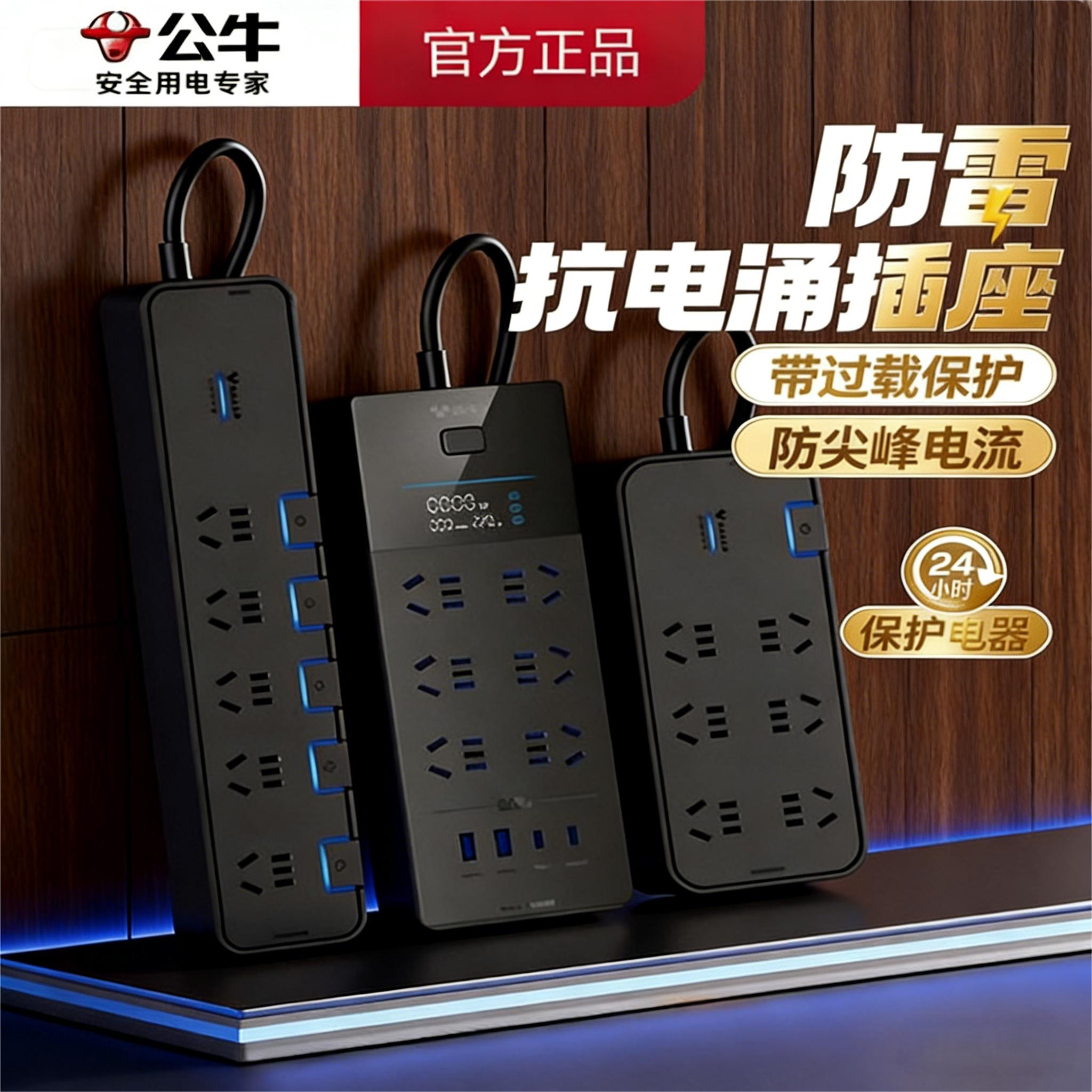 公牛插排插座防雷抗电涌家用宿舍插线板排插拖接线板插排黑色带线