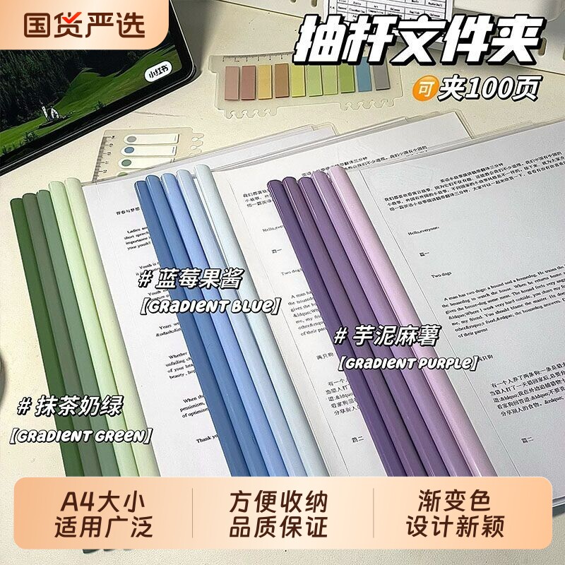 马卡龙加厚抽杆夹文件夹透明插页a4纸收纳拉杆夹固定书夹子办公用品文具抽干夹小学生试卷整理活页资料档案C1