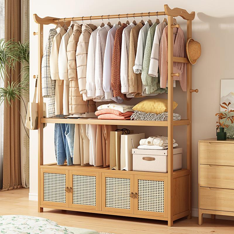 卧室衣帽架落地带筐家用挂衣架实木多功能简易衣服收纳塑藤置物架