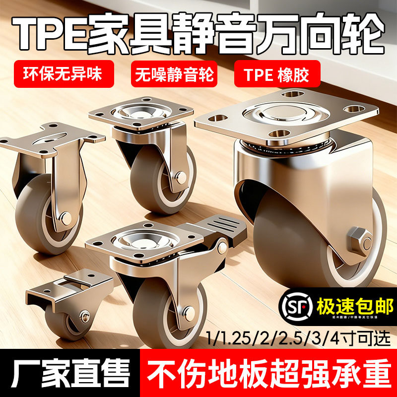 TPE静音1寸万向轮1.25寸平底万向轮1.5寸脚轮2寸橡胶家具轮推拉轮