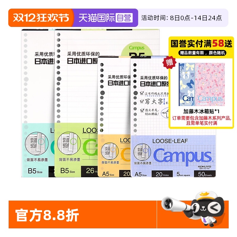 日本kokuyo国誉campus活页本替芯A5/B5/A4横线空白点阵方格英文分栏备注学生可拆卸活页纸20孔/26孔/30孔本芯