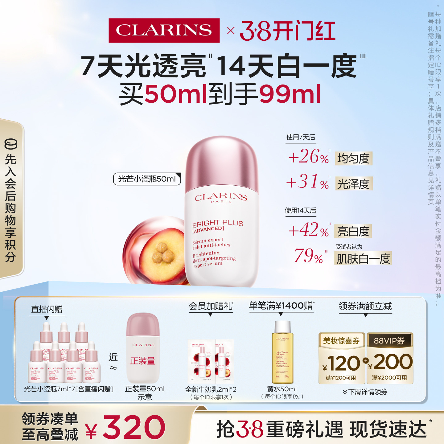 【自营】官方直供 娇韵诗光芒小瓷瓶淡斑精华液50ml(品牌防伪)