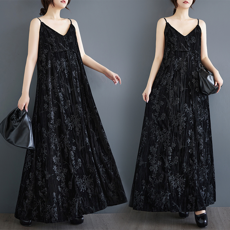 宽松v领丝绒印花吊带裙垂坠感连衣裙女无袖背心裙超长到脚踝长裙