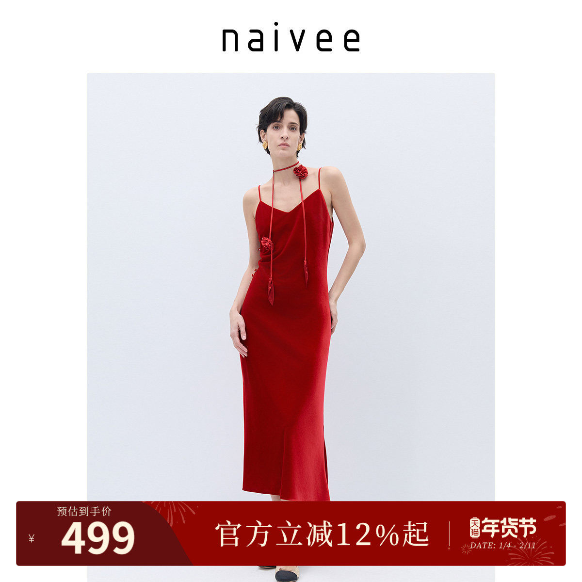 纳薇喜愿系列新年红色丝绒吊带裙V领收腰显瘦连衣裙订婚礼服战袍