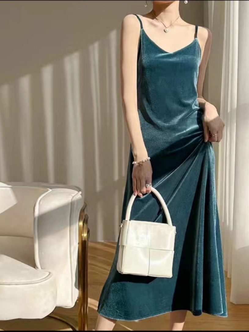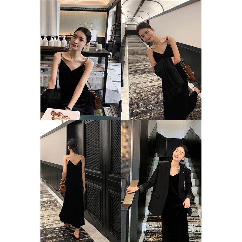 读衣术金丝绒吊带裙性感 秋v领内搭加厚打底裙 到脚踝丝绒连衣裙