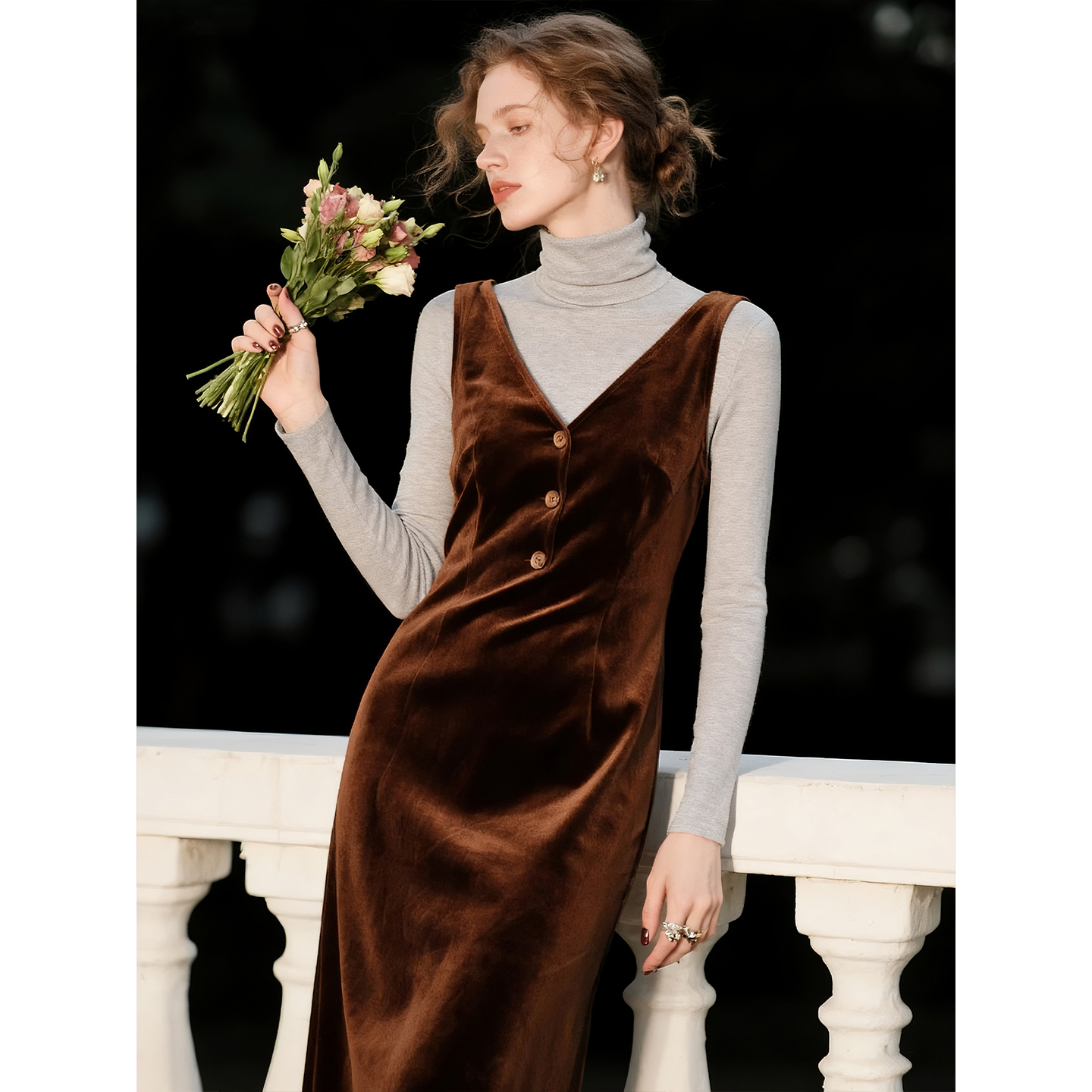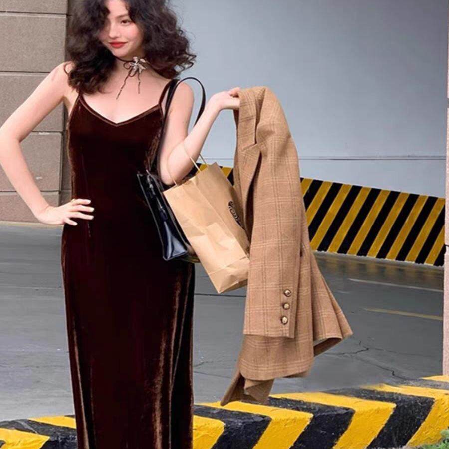 咖啡色金丝绒V领外穿吊带连衣裙长款A字长裙光泽垂坠柔软春夏复古