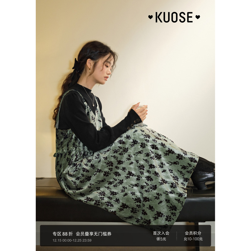 弥古复古碎花丝绒拼接连衣裙女秋冬叠穿吊带裙修身v领气质背带裙