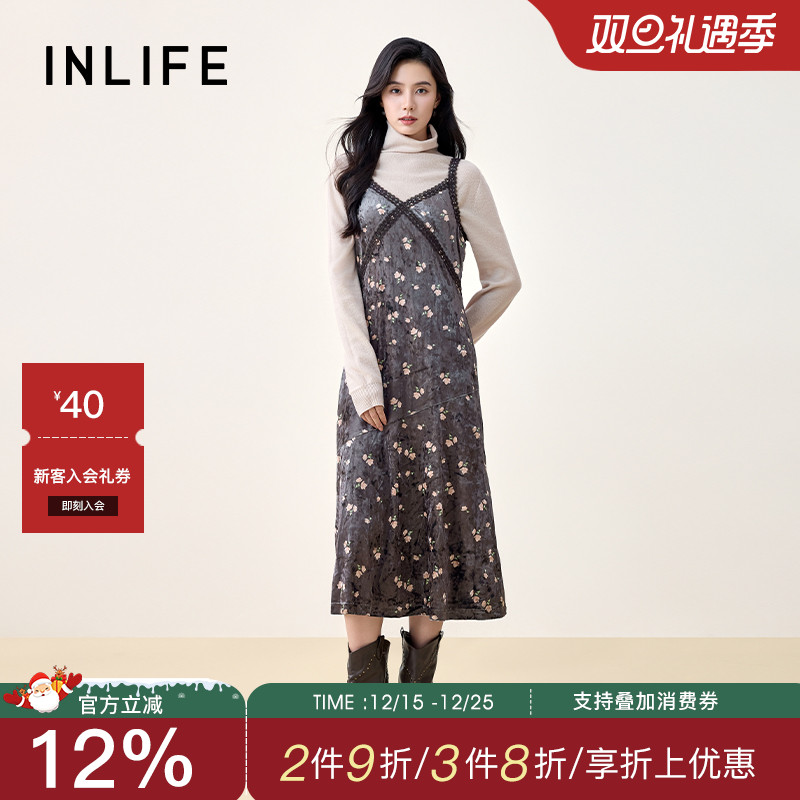 伊纳芙高级气质v领丝绒印花连衣裙冬季新款复古高腰蕾丝吊带长裙