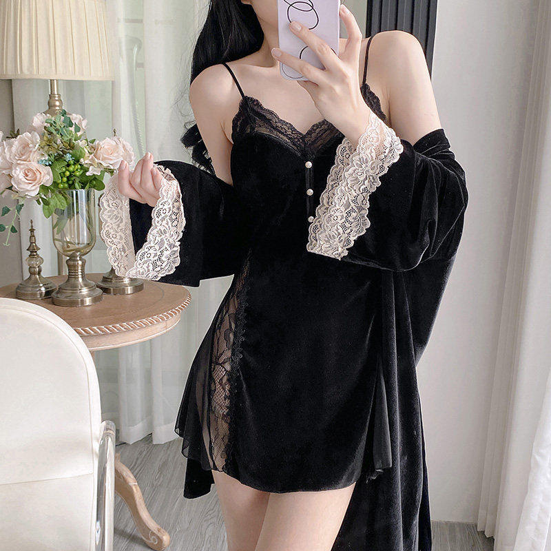 法式金丝绒睡衣女秋冬带胸垫吊带睡袍两件套性感蕾丝美背v领睡裙