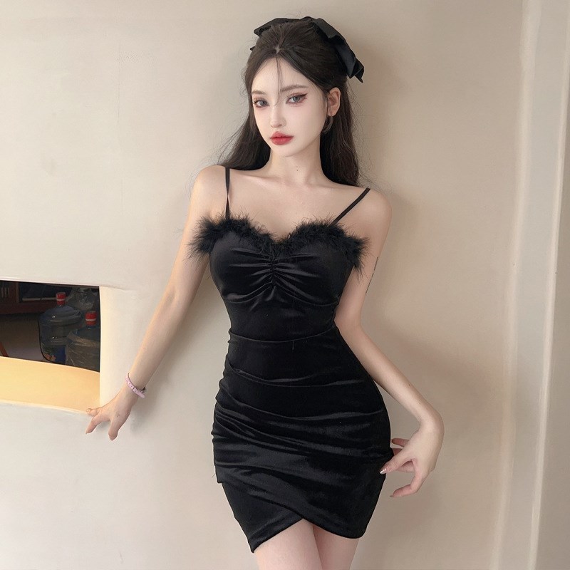 性感纯欲风辣妹丝绒V领吊带包臀时尚打底短裙红色圣诞毛毛连衣裙