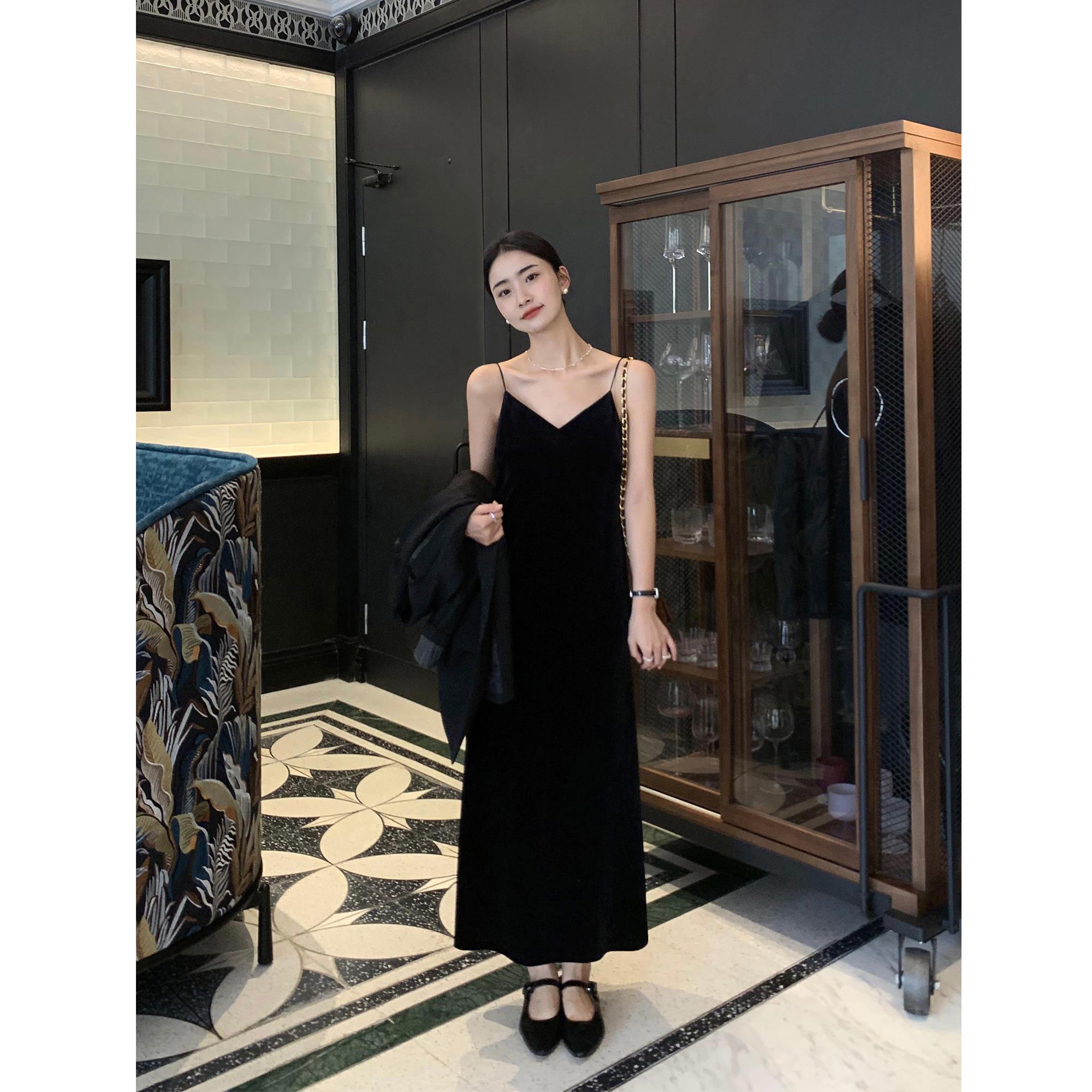 黑色金丝绒v领吊带连衣裙春秋内搭打底裙子高级感气质长裙小黑裙