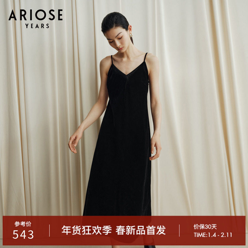 艾诺丝雅诗简约V领丝绒美背显瘦吊带背心连衣裙女春季新40829061