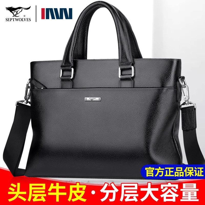 七匹狼真皮男包手提包商务休闲公文包横款头层牛皮男士单肩斜挎包