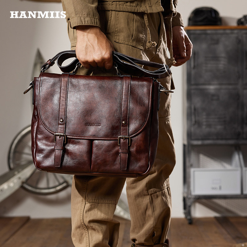 HANMIIS头层牛皮斜挎邮差包真皮公文包商务休闲单肩包手提包男款