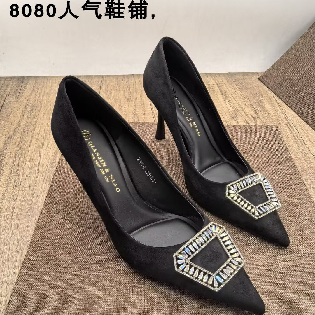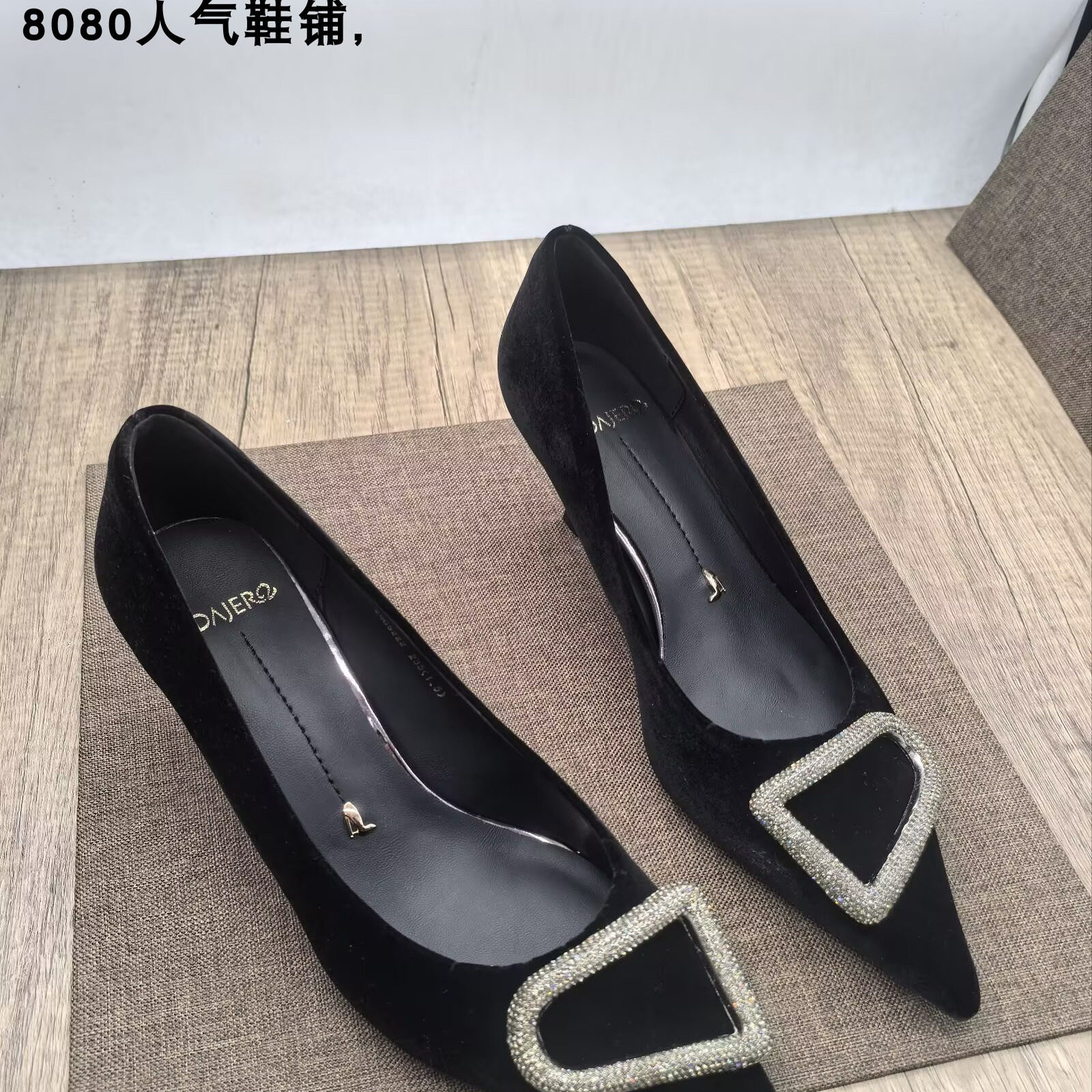 秋冬水钻方扣深口单鞋不累脚高跟职业优雅女鞋黑色尖头绒面1224u