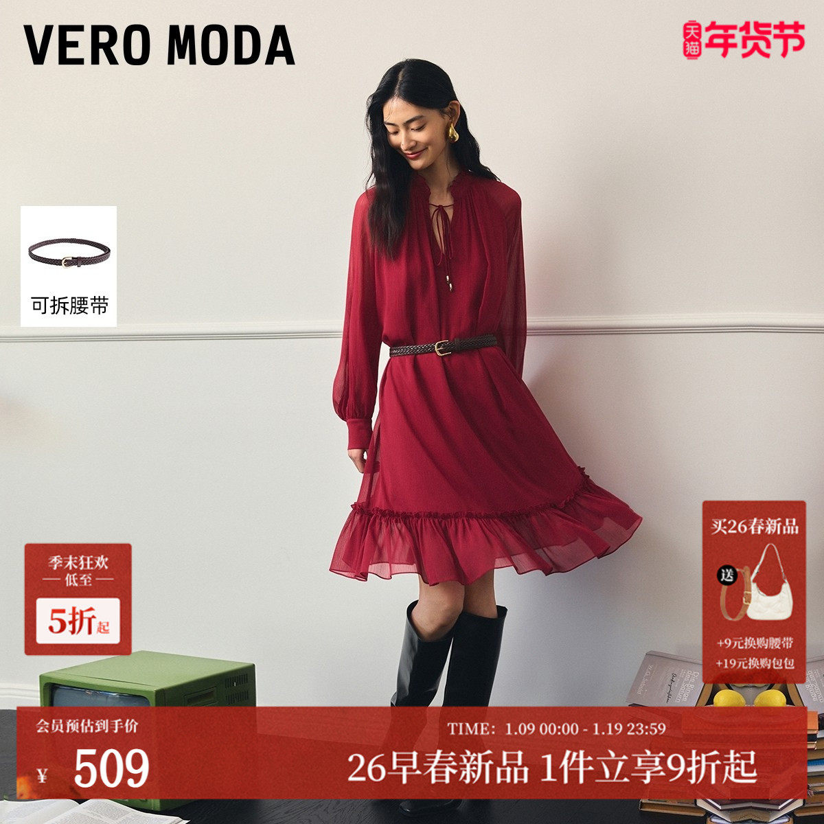 Vero Moda连衣裙2026春季新款灯笼袖系带领雪纺长袖红色裙子纯色