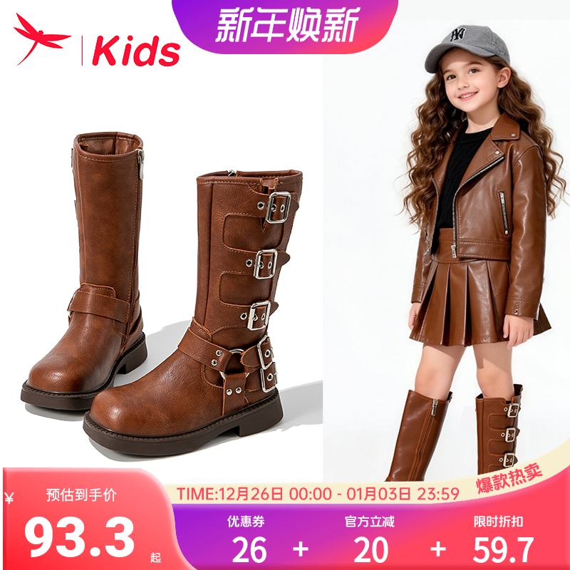 【清仓】红蜻蜓女童靴子儿童长筒长靴2025新款冬季加绒美拉德皮靴
