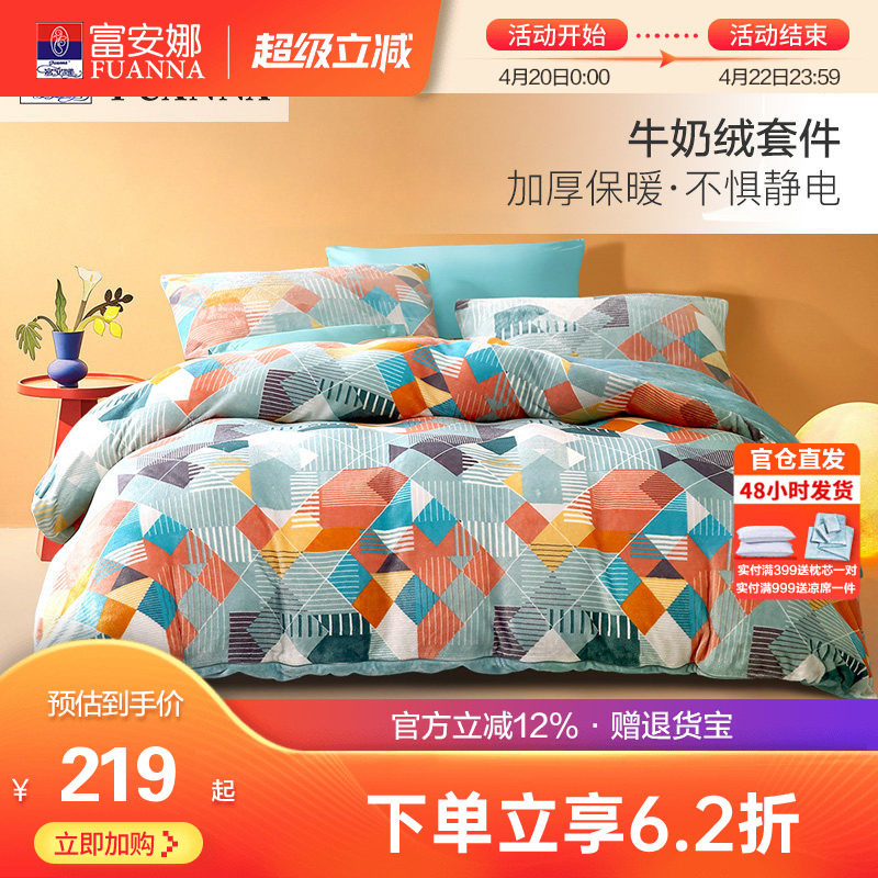 富安娜牛奶绒四件套冬季加厚珊瑚绒法兰绒被套床单床上用品三件套